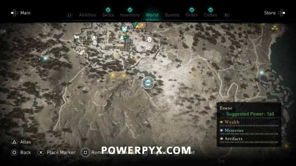 使用信仰之跃跳入深坑中,然后穿过一片很长的平台区域,穿过一堆房间,再沿着跳点和岩壁上凸出的小平台往前走,虽然很麻烦但基本没有岔路。来到一片标有诅咒标记文物的区域,另一侧还有许多小台子。穿过画着骷髅的窗帘,在桌子上的花瓶里可以找到这个不列颠之宝,按【R3/右摇杆】扫描以高亮显示,破坏花瓶拾取即可。