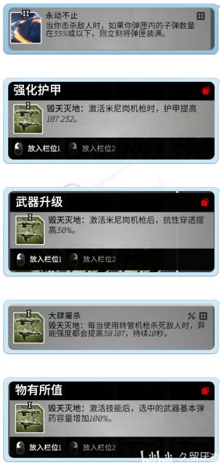 长按毁天灭地激活机枪。并使用毒塔与手雷激活【激励信号】与【技术狂人】技能并卡CD释放来保持技能加成并尽量多的通过机枪进行最后一击来叠加【大肆屠杀】。