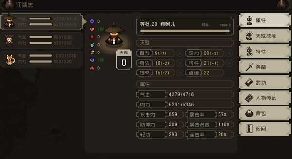 包狗儿到了,就开始练级了,此时你有4个队友,主角需要的是轻功100以上,要高轻功去喂酒,狗儿轻功70就能去嘲讽。
