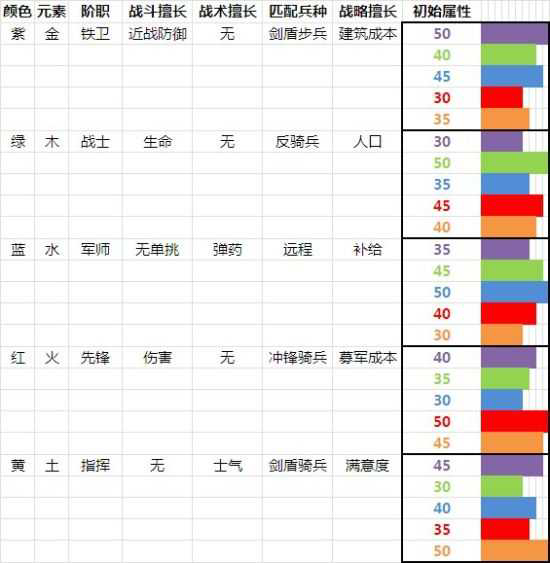 5个属性各自有基础的模板,仔细看一下的话,基本上是顺着相生关系来的:例如金自身50→金生水45→水生木40,然后火克金所以火30→木生火所以木35。
