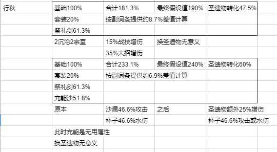 另外,考虑到行秋的战技伤害也非常高,是否需要将原本的15%水伤+20%大招伤害转化为42%的大招伤害,还是要旅行者自行抉择。个人觉得行秋对这套圣遗物依赖性不是很强,毕竟行秋的战技伤害也是不容小觑的。