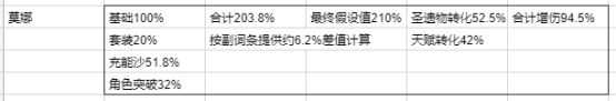 如果为莫娜刷取这套圣遗物,沙漏主词条必定选择充能,那么莫娜保底充能效率就达到了惊人的203.8%,再加上副词条或许会带那么一点,最后大致按照210%进行测算的话,圣遗物加天赋效果总增伤能够达到94.5%。在此基础上,莫娜就可以攻击杯水伤杯2选1,如果副词条歪攻击不多的话,则是攻击杯更强,水伤杯尚可,具体看词条和武器的选择。