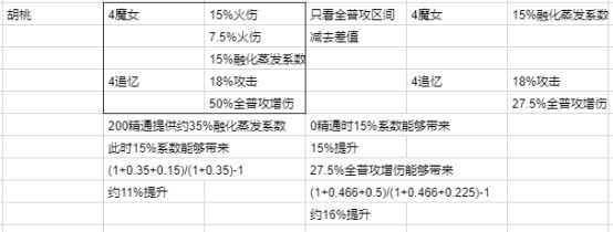 假设胡桃携带4魔女,则拥有22.5%火伤与15%融化蒸发系数,当胡桃自带200精通时,可以提供35%左右系数,那么15%系数加成最后带来的蒸发收益提升为11%左右,当胡桃自带0精通时,15%系数加成则可以实打实带来融化蒸发15%的提升。