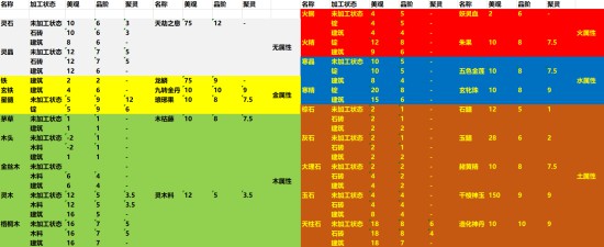 这里放一张所有材料美观度、品阶和聚灵值的图,方便各位查找。