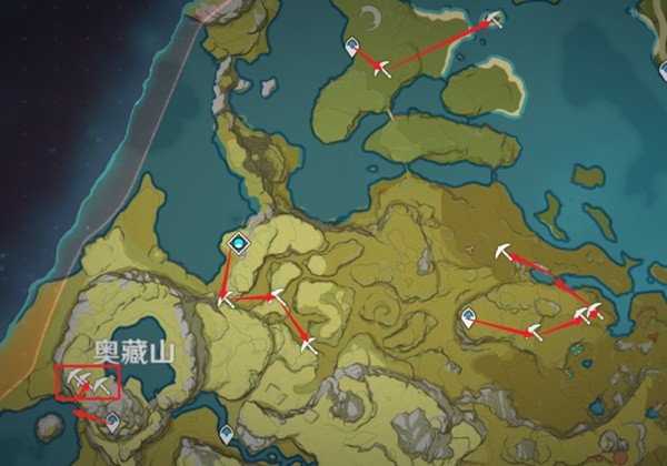 红框区位于山下洞府,按箭头进入,洞内有岩龙蜥与幼岩龙蜥,可以选择带输出位,将其击败或者直接开盾采集,或者无视他们采集。