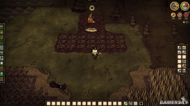 我用控制台开了全物品制作,种植的草树枝什么的也是用控制台调出来的。具体的搭建教程如下,先用草叉挖出下面这样的区域。