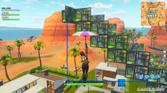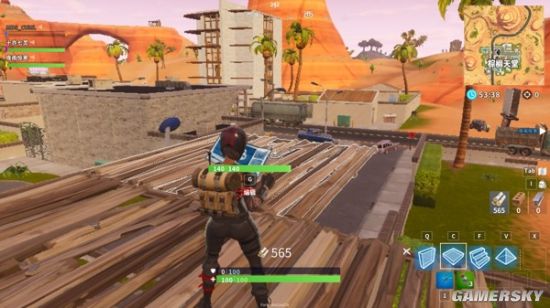 搜索物资大家基本都是熟练贯通,所以白药师将重点放在前期的打架上。沙漠中比较大的房区是天堂,这处城区内部资源很丰富,搜集足够的资源后,我们便可以寻找对手进行战斗。如图,我们在一栋房子上到达另一处屋顶上的时候,如果从地面上行走,那么地面上的物品以及建筑内环境,拖延我们的时间。所以白药师建议大家走空中。这里要提到很多玩家都会犯的一个错误——搭板直线前进。后面的板子一旦被人打碎,我们脚下的路就会瞬间被破碎,从跌落,被敌人淘汰。