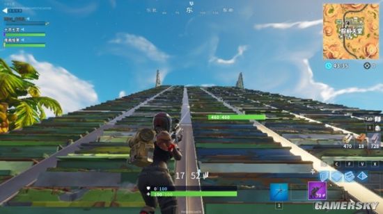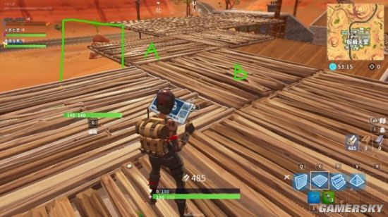 解决办法是:搭板之前,我们多使用一个板子接触建筑物,这样我们板子被击碎,就不会导致很多板子一起破碎,还能在板上进行移动,在敌人没有重武器的情况下,单使用常规武器,击碎板子的速度没有我们搭建板子的速度快,所以不用担心搭建的建筑物被全部击碎,边前进边可以在绿色方框处搭建竖板进行防御,到达目的地,对敌人进行反击。