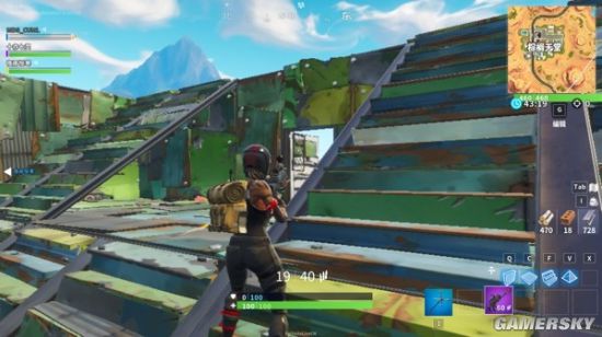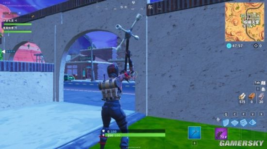 在城区内部有很多类似的门洞,门洞外面就是马路,较为空阔,我们可以依据墙面搭板,使自己增加高度,观察周围可能存在的敌人,记住一条堡垒之夜的规则,前方未知的区域,不能盲目进入,受到攻击,就算侥幸逃脱,也会失去很多材料,得不偿失。