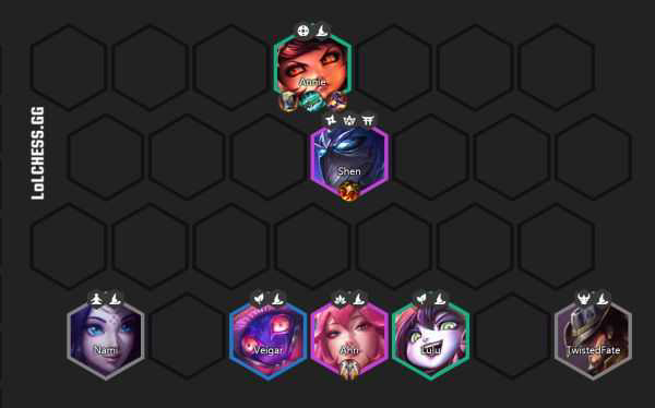 4-1拉7人口,7人口我们就需要直接搜牌了,第一波搜牌我们需要把底牌全部找出来,分别是安妮、娜美、卡牌、露露、小法、狐狸、慎,凑6法师1忍者羁绊。站位如图,安妮顶在最前面,慎在安妮后面主要是能够群体嘲讽对面打个控制,后排法师站一排即可。同时,小嗨建议大家可以再7人口直接搜安妮、露露、小法、这3张牌,安妮这张牌是非常重要的,我们需要将安妮追到3星,否则后期2星安妮就不能支撑我们这个阵容的坦度。一般安妮到3星我们就可以直接拉8人口了。