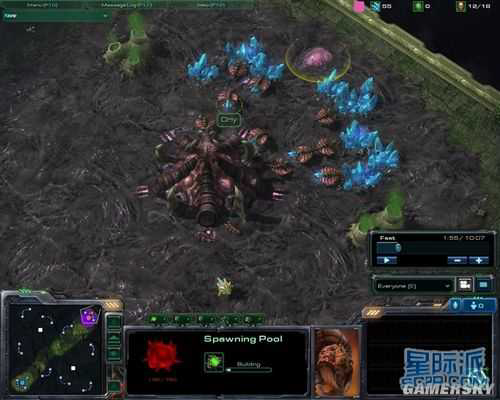 开局:13人口狗池。补充两个农民。然后让一个雄蜂去对手家中探明对手意图。再补充一个房子和农民。