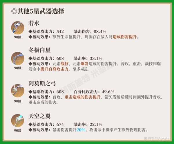 除了猎人之径外,其他5星武器中可以选择若水、冬极白星、阿莫斯之弓、天空之翼,由于提纳里自身突破没有暴击率、暴击伤害加成,因此推荐优先选择双暴类武器以降低圣遗物选择压力。