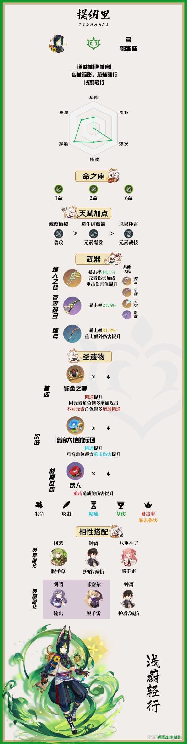 《原神》3.0版本新加入的五星草系角色提纳里,很多玩家想要培养此角色但不清楚怎么搭配装备和阵容,下面请看由“Asgater”分享的《原神》提纳里一图流培养攻略,一起来看看吧。