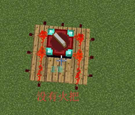 7、在刚刚放红石的方块上放上一圈红石火把,正面一样不放。