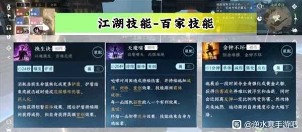江湖技能搭配百家技能换生诀,消耗血量获得护盾,护盾结束时造成范围性的爆炸伤害,金钟不坏伤害减免反弹伤害,天魔笑对周围持续群攻,有减速封脉重创吸引效果,结束后短暂眩晕自己。