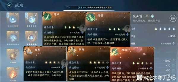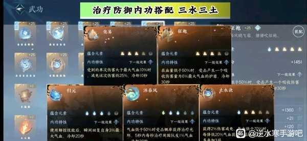 内功搭配推荐三水三土,归元,沐春风,画意,征袍,止水诀。需要归元画意征袍最后一元素随机出山水后期可以把沐春风换成幻化冥河水,敌千钟也可以过渡使用