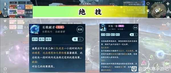 门派技能护攻有减伤和反击效果。绝技长歌线军十秒内大幅增加队友的移速和攻速,还有元速伤害狂发一怒使用后解控长按开启。每一门都会获得高额的移速和攻击力,结束后会自身虚弱无法行动,升阶后取消虚弱状态。四门之后每一门都会回复自身血量10%,根据不同场景使用不同的技能,PVP多带提高存活带来伤害为主,比如幻身诀金中不坏,后期有了不攻可以替换下来一个PVE以提升自己的坦度为主。技能进阶出战约定彩翼清风垂露。属性选择气海满后加身法。