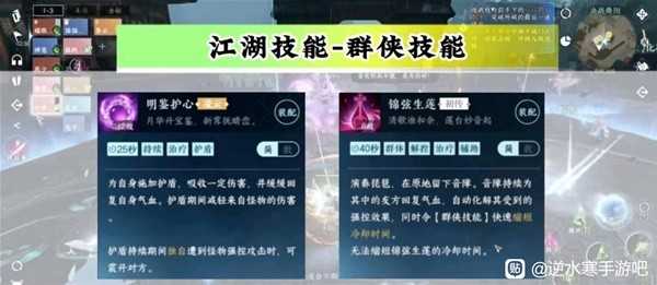 群侠技能明剑护心为自己施加护盾,吸收伤害回复气血,锦弦生莲护盾技能在护盾内有霸体和回复效果。