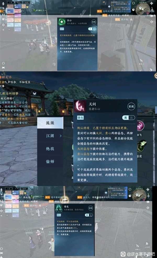 职业特质介绍可以理解为职业专属的效果,医心受到强控,两秒内回复气血。天问,可以切换输出姿态天问和治疗姿态素心。
