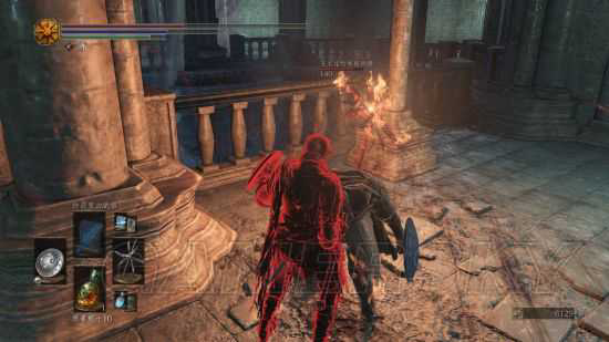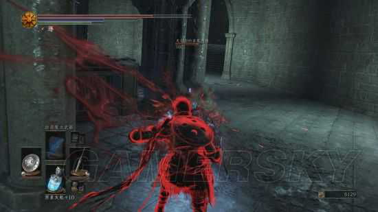 火刑架这个武器也真是奇怪,明明戟的攻击模组,攻击和黑骑士/古达一样是下劈砍接横扫。伤害类型却和刺剑,长枪一样是突刺属性,用下劈横扫的动作享受狮子戒指的突刺加成。