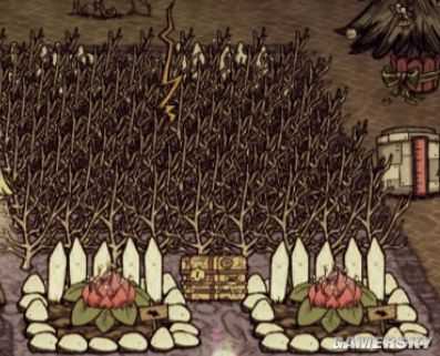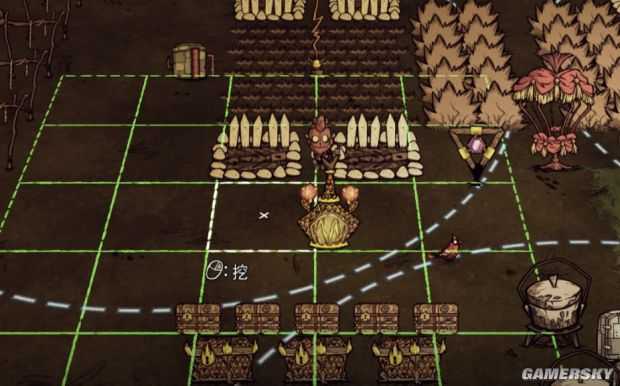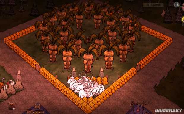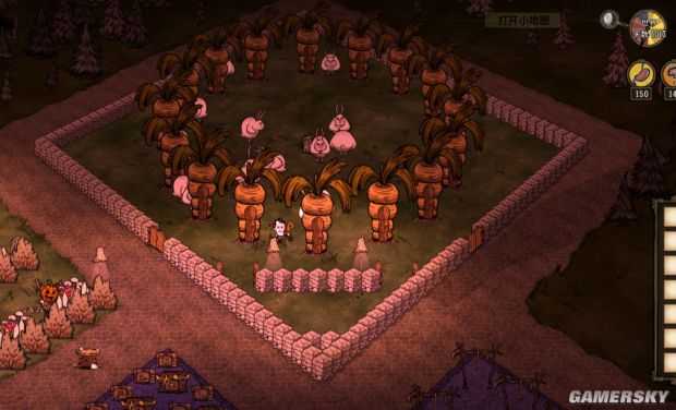 如果觉得空了点可以弄点墙,兔人可以做个陷阱刷肉(没墙防狗更方便点,反正这游戏也不缺吃的其实刷不刷也无所谓)如果不做墙也可以在四个角落种点草浆果花装饰,也可以中间放个蜘蛛巢。
