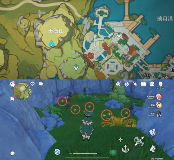 3)天衡山山洞中有6只晶蝶,从地图下方传送点一直走可以看到好多丘丘人,在它们背后山洞中就能找到晶蝶