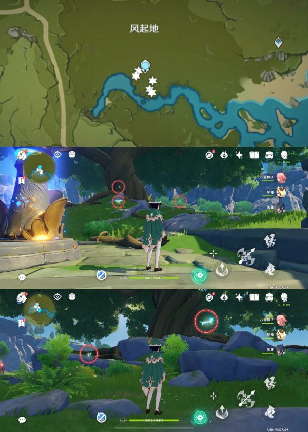 1)风起地的七天神像处,在大树周围有5只晶蝶,点位如下
