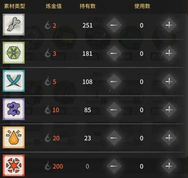 以下是素材兑换炼金值的兑换比率: