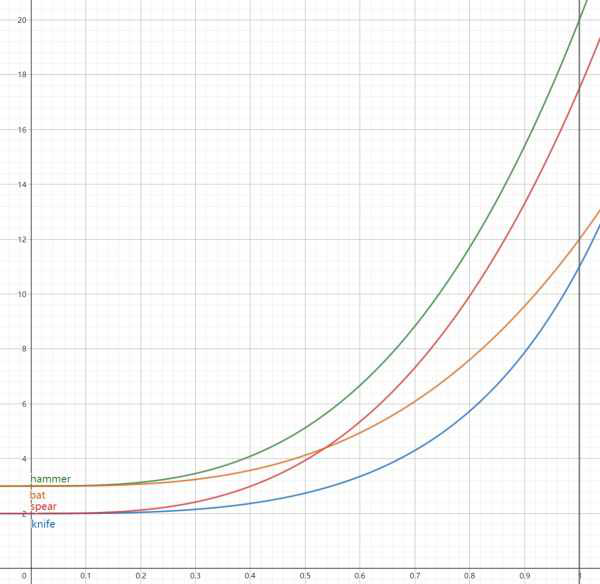 因此各近战武器(小刀默认怪物为沉睡状态)的伤害曲线总结如下图:
