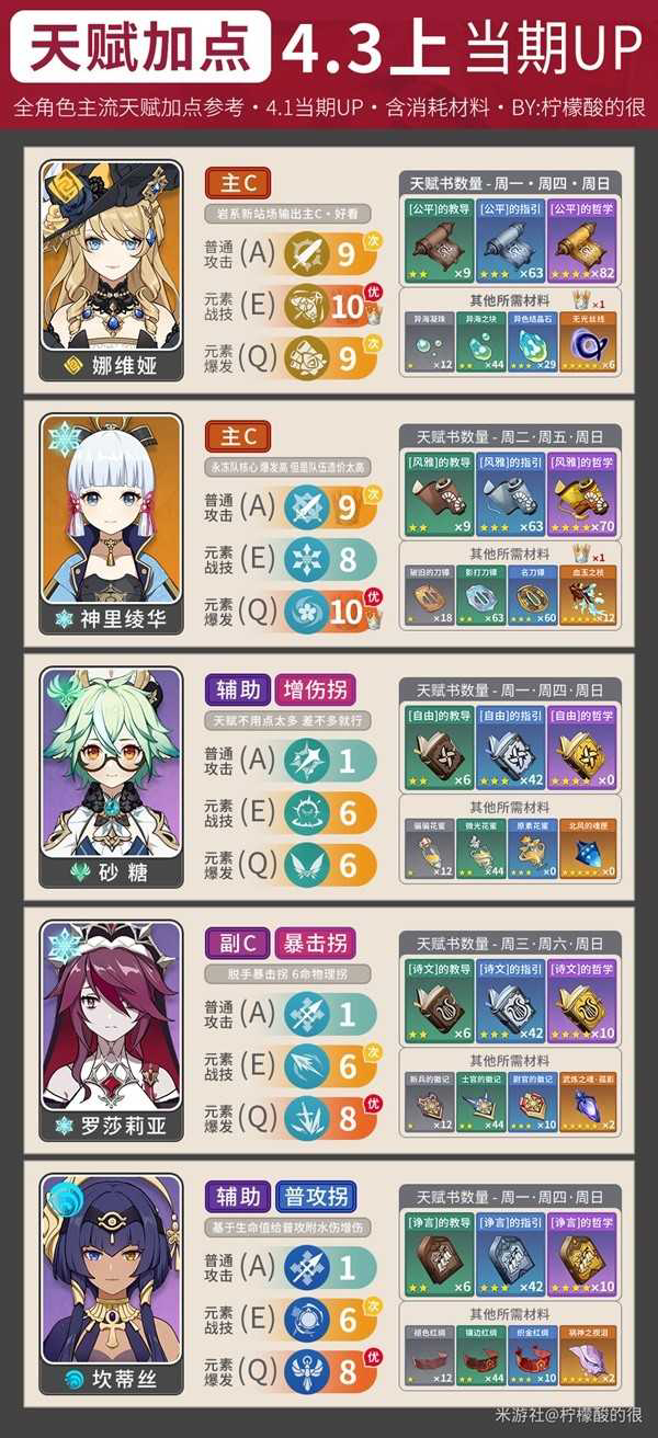 《原神》4.3版本已经更新,并且加入了新的角色娜维娅,那么现版本的角色要如何加点呢?请看下面由“柠檬酸的很”带来的《原神》4.3版本全角色主流天赋加点推荐,希望对大家有用。