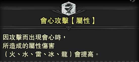 会心攻击【属性】技能在前面所有版本中,都必须要搭配火龙两件套才能产生,因此在以前的版本,属性武器由于配装方面受到极大限制,地位大多都无法与物理流派相比。