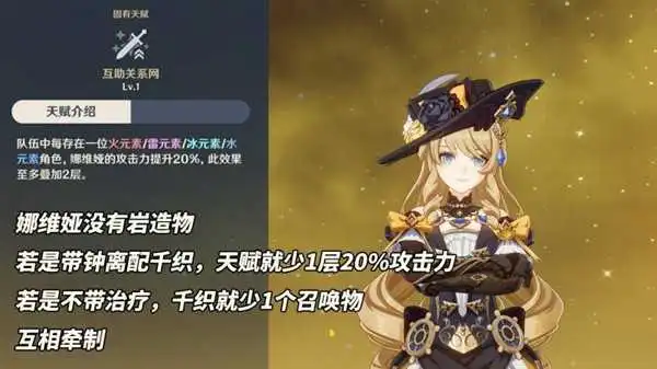 ②娜维娅与千织搭配互相牵制,要么娜维娅天赋的攻击力少20%,要么千织召唤物少1个。最终配队大概率是‘娜千钟班’,娜维娅少20%攻击力总比千织召唤物伤害掉一半好。