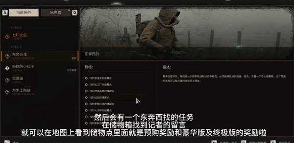 序章完成来到避难所,接取“小菜一碟”任务并完成,然后会有一个“东奔西找”的任务,在储物箱找到记者的留言,就可以在地图上看到储物点,里面就是预购奖励和豪华版终极版的奖励。