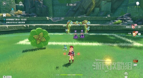 出现比较聚集的史莱姆群时,要远离史莱姆群(不要站在史莱姆的中间),站在史莱姆一侧使用元素战技将一群史莱姆一起推入就近的球门,门前如果有障碍物,等障碍物移开之后再继续推,否则在障碍物移动路线上的史莱姆会被推走(远离球门)。