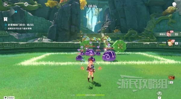 除可莉的重击之外,烟绯的战技可以将史莱姆推的更远(攻击范围也更大,但容易将史莱姆打散),普攻的攻击方向比较精准。减少连续攻击,普攻一次之后调整角度继续攻击,将史莱姆推入较近的球门内。在史莱姆较多但分散的情况下,建议靠近史莱姆攻击,否则烟绯的自动锁敌可能会锁在其他史莱姆上。只有将场上所有的史莱姆全部推进球门才会更新下一波史莱姆,每满1分钟即便场上的史莱姆没有全部进门,也会刷新新的史莱姆,但之前的史莱姆会全部消失。