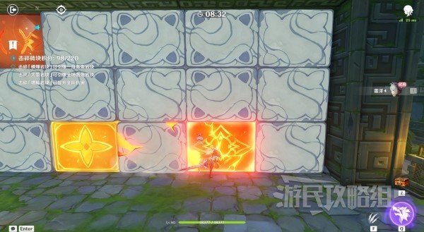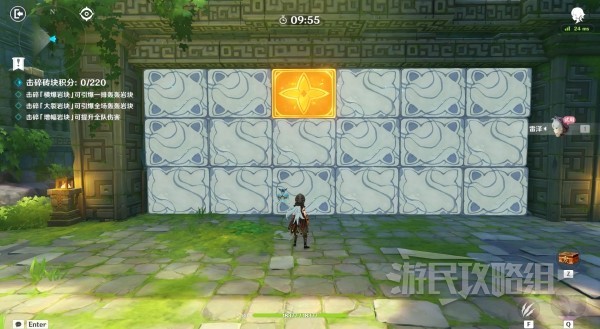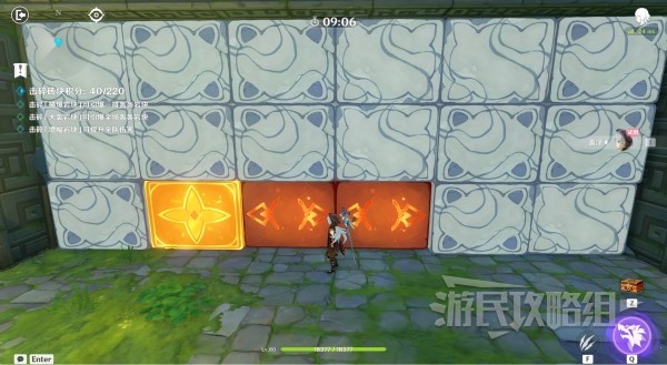 本关是消除游戏,用雷泽的普攻、战技和爆发攻击方块来消除方块,消除至目标积分即可完成挑战。本关共出现四种方块,白色为普通方块,发光的四角星为增幅岩块,能够提升伤害,遇到时可以先将下方普通方块打碎让其落下来优先消除。雷泽的重击可同时攻击横向的3个方块,从始至终优先瞄准增幅岩块反复重击的话,大约1分钟左右就能达成目标积分完成此挑战。