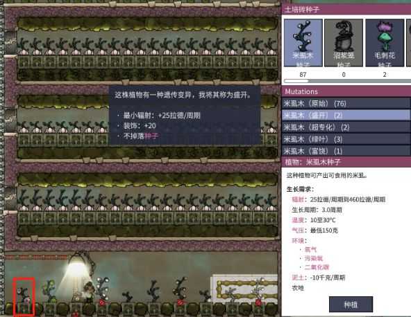 请注意,以米虱木为例,原始植株在460拉德/周期的辐射内下掉落的种子才会有几率发生变异,变异的是种子不是本体植株!用变异的种子才能培育变异植株,但变异植株不能收获任何种子。所以说,要培育一块特定变异植株农场,是需要大量选种育种的。
