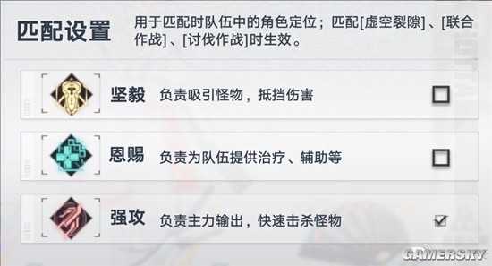 在匹配设置中会有详细的说明。比如玩的是输出系的共鸣那更适合强攻,如果是像星寰/马克一类的坚毅共鸣也可以玩T坦克系玩法。如可可丽特,奈美西斯一类的则可以偏向恩赐玩法。