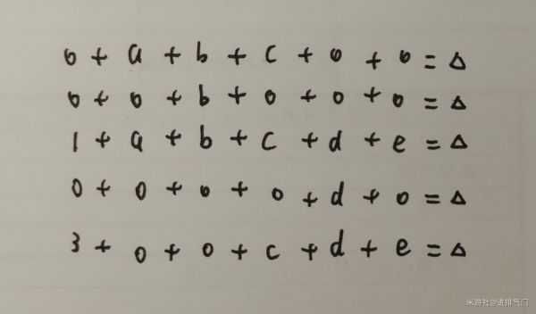 设需转动第一个a次,第二个b次,第三个c次,第四个d次,第五个e次,设4的倍数为△
