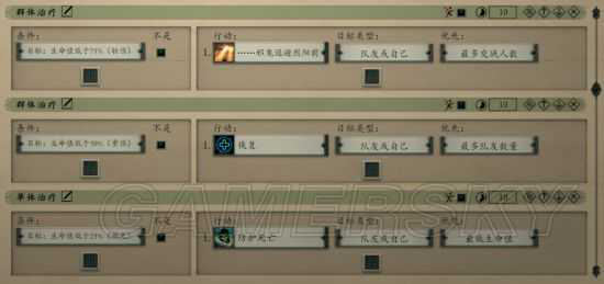 条件选择:目标的生命值,加血少的75%血就可以加了,加血多的50%就可以加了,紧急保命的技能可以25%开,此时建议选择释放时间瞬发0.5秒的技能,你肯定不想队友快死了,还慢慢读一个3秒的治疗来救人。