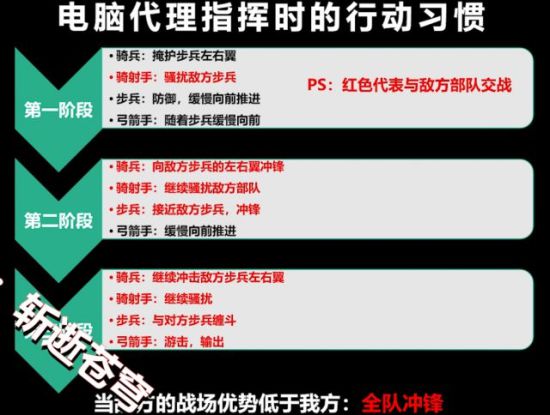 AI会让步兵和弓箭手在外围组成圆桶阵型,骑兵和小部分步兵会被围在中间,当敌人冲散阵容后会变成横排模式,再被冲散就会溃败。