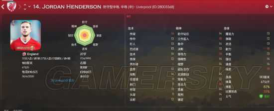 亨德森是组织核心,负责接应、调度皮球,同时也具备一定防守能力,传球16,视野14,团队合作17,工作投入18,意志力18,防守站位14,盯人13,抢断14,和锋芒毕露的热刺双星相比,亨德森显得格外的低调,但却是经验最丰富,最稳定的一环。他也是英格兰在世界杯时场上队长的有力人选。