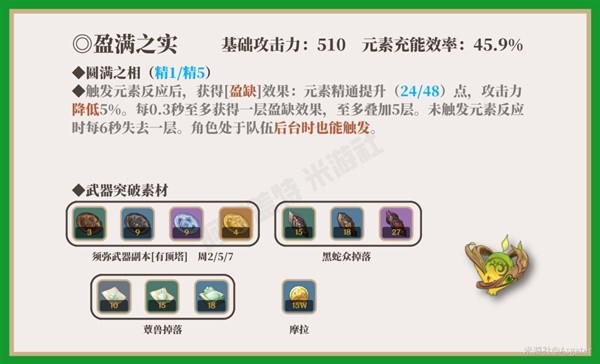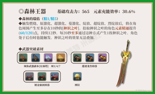 4星武器中,基础攻击力仅次于暗巷闪光(610),突破增加元素充能效率。掉落“种识之叶”全队都可以拾取,谁拾取谁加精通,最多拾取1枚。