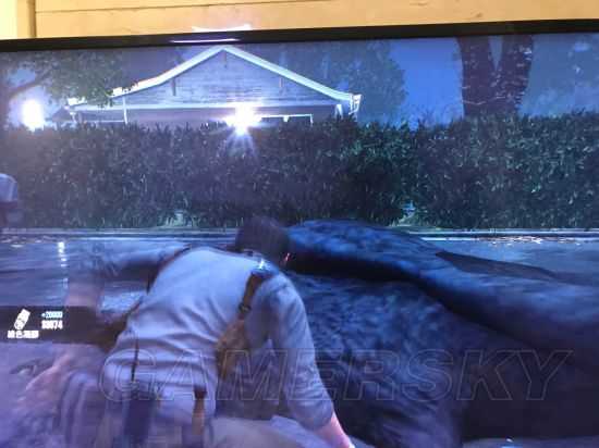 第四章从南边的安全屋出来,走西侧大路,跑到这个米切尔家族建筑公司时,你会看到有个敌人往前跑,追到你安全屋的后面,你就会看到他在疯狂敲击安全屋的墙,背杀他,出来之后,发财了发财了。
