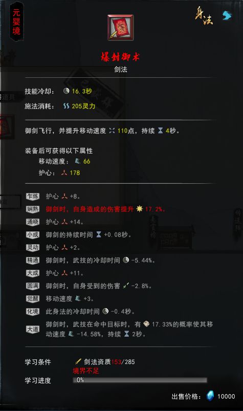 身法要有减普攻CD的词条,元婴红字能减到25%以上,推荐剑修的御剑,可以刷增加持续时间和减身法CD的词条,基本一直在飞;