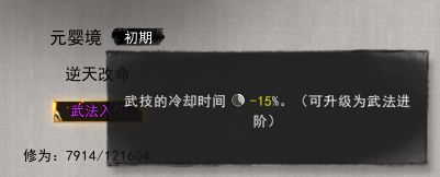 另外:今天升元婴逆天改命新发现一个“武法入门”,大部分游戏攻略网站上都没列这个,不知道是不是跟血手一起刚更新出来的,百度搜到后面有进阶和精通,最高据说能减40%普攻CD。
