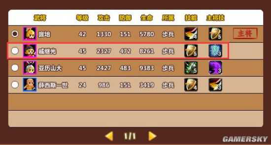 戚继光的武将技能是耐火枪5,主将技是战盾3。