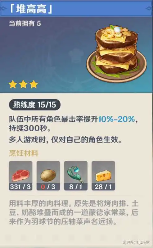 《原神》中有各种各样的食谱,其中堆高高可以为玩家们提供很可观的输出属性,想要大量制作的玩家请看下面“HJS落雪”分享的《原神》堆高高食材获取线路一览,希望能够帮助大家。
