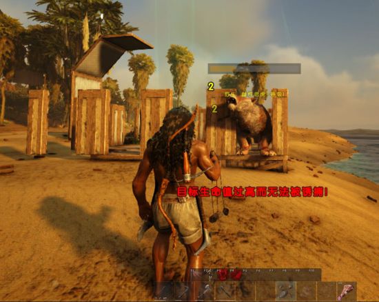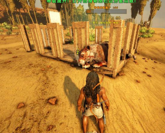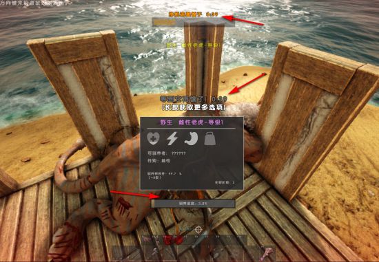 困住老虎后,走到老虎身边(如果你在老虎的前面它会持续攻击的,绕道侧面),如果发现只有「按E解除」,那就是不够近或者角度不对(对着头的方向)。找到正确角度就会出现喂养提示了,此时把背包里的【优质肉】拖到快捷键「0」,然后按照提示按E喂养!