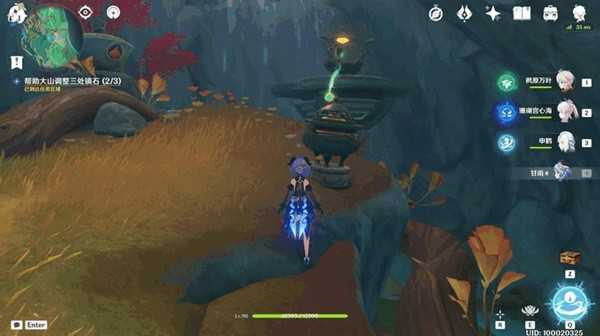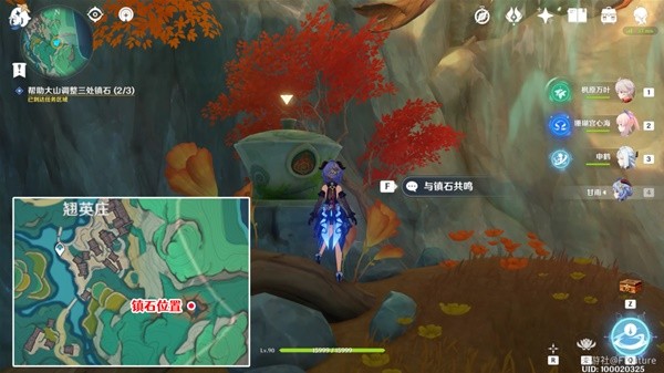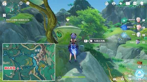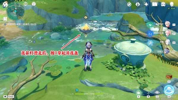到下图所示位置,与这里的镇石交互共鸣。共鸣后,西南边这里的莲花灯就会顺着水流飘下来。